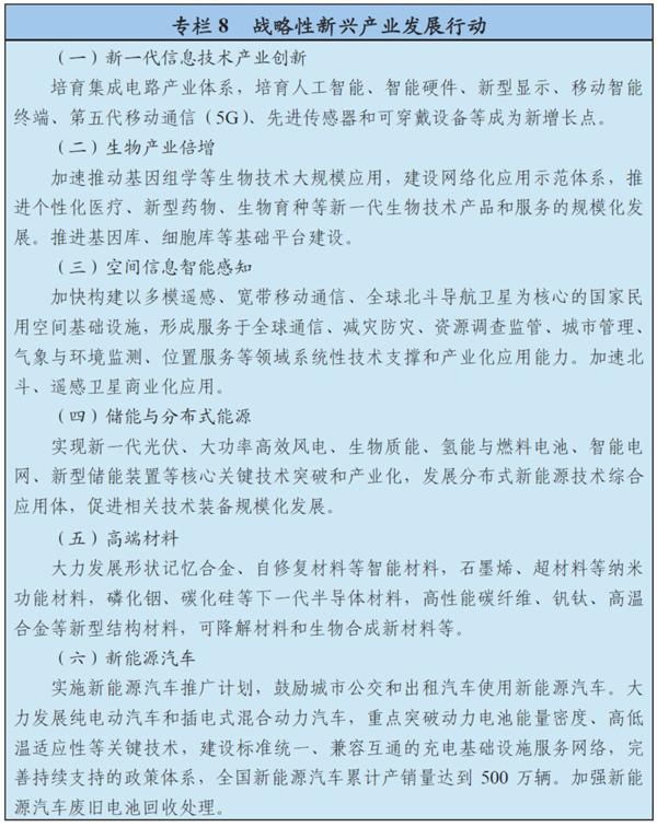 支持新一代信息技術(shù)、新能源汽車(chē)、生物技術(shù)、綠色低碳、高端裝備與材料、數(shù)字創(chuàng)意等領(lǐng)域的產(chǎn)業(yè)發(fā)展壯大。大力推進(jìn)先進(jìn)半導(dǎo)體、機(jī)器人、增材制造、智能系統(tǒng)、新一代航空裝備、空間技術(shù)綜合服務(wù)系統(tǒng)、智能交通、精準(zhǔn)醫(yī)療、高效儲(chǔ)能與分布式能源系統(tǒng)、智能材料、高效節(jié)能環(huán)保、虛擬現(xiàn)實(shí)與互動(dòng)影視等新興前沿領(lǐng)域創(chuàng)新和產(chǎn)業(yè)化,形成一批新增長(zhǎng)點(diǎn)。