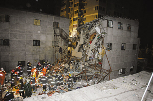 昨晚10時許,發(fā)生坍塌的工棚西半邊已經整體缺失,東半邊支架亦扭曲變形。數十名消防人員和兩條搜救犬正在現場緊張搜救,十余輛急救車在現場待命,大批警察趕到現場維持秩序,上千群眾圍觀。不時有急救車警笛長鳴拉著受傷人員離去。