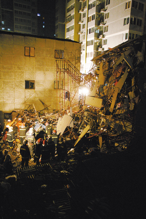 本報訊 昨晚9時10分許,宣武區(qū)北緯路附近的暢柳園小區(qū)西南角一3層工棚發(fā)生坍塌,20余名工人被埋。截至今日零時,26人被送醫(yī)院,其中兩人死亡。1時左右,有吊車進入,準備將發(fā)生坍塌工棚的東側部分拆除。