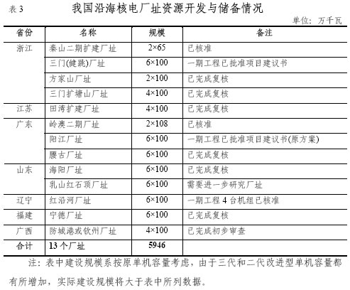 經(jīng)過多年努力,我國已儲備了一定規(guī)模的核電廠址資源。除已建和在建工程外,在沿海地區(qū)開展前期工作已較充分的廠址還有5000多萬千瓦,具體廠址資源開發(fā)與儲備情況見表3。