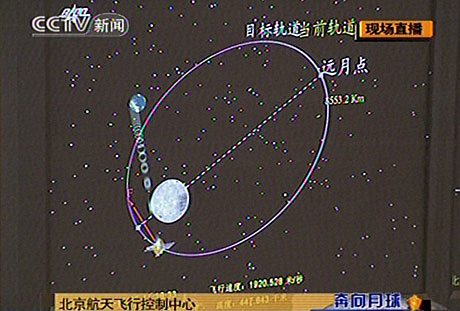 11時15分,北京航天飛行控制中心調(diào)度地面測控系統(tǒng),向沿著地月轉(zhuǎn)移軌道高速飛行的“嫦娥一號”發(fā)出指令,衛(wèi)星發(fā)動機(jī)準(zhǔn)時點火,工作22分鐘后,正常關(guān)機(jī)。隨后,北京中心對各項測量數(shù)據(jù)的計算結(jié)果表明,衛(wèi)星順利進(jìn)入周期為12小時的橢圓環(huán)月軌道。