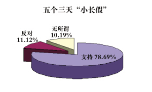 據(jù)統(tǒng)計(jì),昨天上午方案公布至22時(shí),五大網(wǎng)站共有約45萬名網(wǎng)民參與了調(diào)查。投票結(jié)果顯示,近九成網(wǎng)民支持國家法定節(jié)假日總天數(shù)由10天增加到11天,七成多的網(wǎng)民支持增加清明、端午、中秋三個(gè)傳統(tǒng)節(jié)日為國家法定節(jié)假日,八成網(wǎng)民支持保留十一國慶節(jié)和春節(jié)兩個(gè)黃金周,八成多的網(wǎng)民支持將春節(jié)放假時(shí)間提前到除夕,近八成網(wǎng)民支持將元旦、五一及三個(gè)新增法定假日與前后周末調(diào)整成連續(xù)三天的“小長假”,九成多的網(wǎng)民支持全面推行職工帶薪休假制度。
