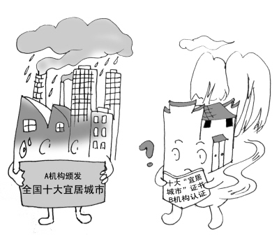 爭(zhēng)議之二,評(píng)選結(jié)果頻頻鬧出“烏龍”事件。最典型的例子是2005年,重慶市剛被某商業(yè)機(jī)構(gòu)高調(diào)評(píng)為“中國(guó)十大宜居城市”沒幾天,環(huán)?偩志统鼍邎(bào)告,認(rèn)定重慶屬于“十大污染城市”之列。