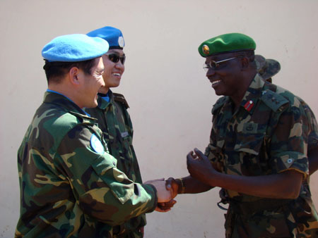 頭戴別有“地球和橄欖枝”徽章的藍色貝雷帽、身穿迷彩服、胳膊上佩戴著五星紅旗臂章的135名官兵精神抖擻地走下懸梯。等候多時的聯(lián)合國、非盟和蘇丹官員立刻上前迎接這批遠道而來的中國客人,而一個多月前已先期抵達的5名中國維和工兵也到達現(xiàn)場和同事們回合。