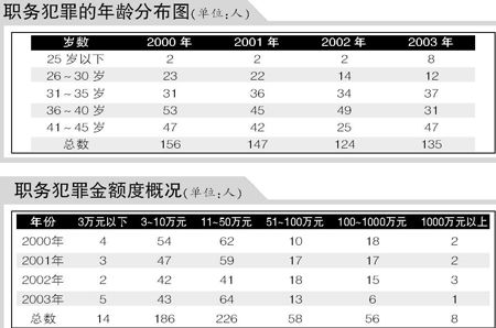 盧鐵峰說,目前,廣州青年職務(wù)犯罪人數(shù)的85%年齡在30歲~45歲,他們掌握了一定權(quán)力,有許多是單位和部門主管等。據(jù)不完全統(tǒng)計(jì),2000年廣州青年職務(wù)犯罪中的單位領(lǐng)導(dǎo)(包括部門領(lǐng)導(dǎo))為98人,2001年為99人,2002年為63人,2003年為71人,其中不乏處級、廳局級干部。