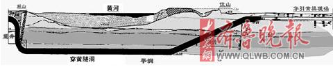 在車上,傅總工給記者畫了一張隧洞的示意圖。記者看到,黃河隧洞由斜洞、平洞、豎洞三個部分組成。其中,入口是一個豎洞,從江蘇揚州即長江下游抽引而來的長江水,經(jīng)過一路奔波,就從這里入洞。和豎洞底部相連接的,是一個平洞,位于黃河河床下70米的位置,長江水從豎洞飛流直下,經(jīng)這里穿過黃河,然后,長江水從斜洞奔騰而出,流入輸水管道,前往京津地區(qū)。