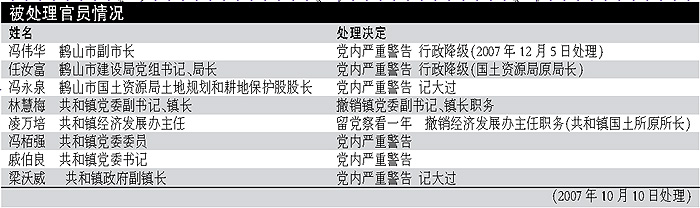 據(jù)監(jiān)察部、國(guó)土資源部12月11日發(fā)布的通報(bào),鶴山市通過(guò)偽造虛假材料和化整為零的辦法,擅自調(diào)整規(guī)劃、違法補(bǔ)辦手續(xù),違規(guī)批準(zhǔn)該市共和鎮(zhèn)3626.8畝土地用于工業(yè)開發(fā),受到監(jiān)察部、國(guó)土資源部專案調(diào)查組的嚴(yán)厲批評(píng)。記者采訪了解到,江門市紀(jì)委、監(jiān)察局已經(jīng)對(duì)鶴山市副市長(zhǎng)馮偉華給予嚴(yán)重黨內(nèi)警告、行政降級(jí)處分,給予國(guó)土局原局長(zhǎng)任汝富黨內(nèi)嚴(yán)重警告、行政降級(jí)處分。