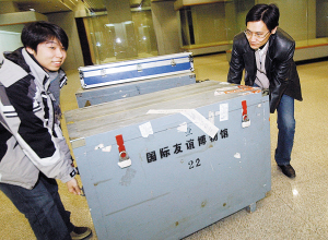 昨天下午1時(shí)許,在工作人員嚴(yán)密押送下,4個(gè)裝載著國(guó)禮珍品的密封箱運(yùn)抵周鄧紀(jì)念館院內(nèi)。還未見珍品,那些專門為展品“量身定做”的箱子就讓人很感興趣,每個(gè)箱子都有1米多高,由于展品極其珍貴且是易碎品,在包裝時(shí)里面不僅加了防震的材料,箱子外面也特別注明易碎標(biāo)志,每一件珍品都被固定在專門的錦盒中,且是根據(jù)它們的大小和形狀量身定做的。