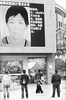 今天(注:1月15日)下午,記者在浙江臺(tái)州臨海市崇和門廣場(chǎng)100余平方米的大屏幕上看到,該市法院正把欠債不還的老賴的彩色照片以及家庭住址、職業(yè)和未履行債務(wù)情況等,通過大屏幕進(jìn)行公開循環(huán)播放。