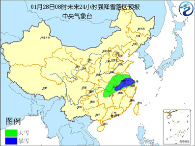 中新網(wǎng)1月28日電 中央氣象臺今天早晨六點鐘繼續(xù)發(fā)布暴雪紅色警報:受冷暖空氣的共同影響,預計今天白天到夜間,湖南北部、湖北東部、河南東南部、安徽大部、江蘇大部以及浙江西北部等地有大雪,其中,安徽中南部、江蘇中南部、湖北東南部等地的部分地區(qū)有暴雪。