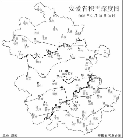 中新網(wǎng)1月31日電 據(jù)問天網(wǎng)消息,安徽省氣象臺消息,截至今天早晨08時,全省各地仍有積雪,其中沿淮到江南北部積雪深度普遍在10厘米以上,江淮中部和沿江東部超過25厘米,最深金寨、霍山為41厘米。