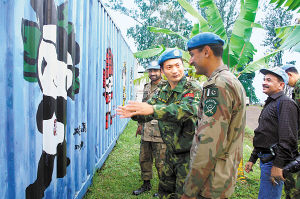 為了宣傳奧運(yùn),維和官兵在營(yíng)院里面制作了各種各樣的奧運(yùn)標(biāo)志。充作庫(kù)房的集裝箱上噴繪的是福娃的形象,草坪中的一片空地上,則是官兵們用簡(jiǎn)易器材做成的五環(huán)圖案和“Beijing2008”字樣。作戰(zhàn)組參謀張寶軍向前來(lái)參觀的外國(guó)友人一一作著介紹,還特別介紹了奧運(yùn)會(huì)會(huì)徽標(biāo)志代表的里程碑、承諾、形象、美麗、英雄、精神、邀請(qǐng)等七層含義。當(dāng)?shù)亟逃齾f(xié)會(huì)的阿里特邊聽(tīng)邊記,還將中國(guó)印和五個(gè)福娃的形狀畫(huà)了下來(lái)。聯(lián)剛團(tuán)志愿者部門(mén)的卡爾松則連聲說(shuō),要調(diào)整假期到北京去看奧運(yùn)會(huì)比賽……