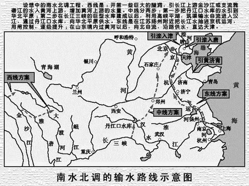 南水北調(diào)工程輸水示意圖。西線:開鑿一些巨大的隧洞,引長江上游金沙江或支流雅礱江的水入黃河上游,增加黃河上游的水量。中線分兩步:第一步把丹江口水庫的水引到華北平原;第二步在長江三峽的巨型水庫建成以后,利用高峽平湖,筑渠輸水自流進入漢江,通過丹江口水庫,向華北平原供水。東線:在江蘇揚州附近把長江水抽進京杭運河,用閘控制,逐級提升;在山東境內(nèi)過黃河以后,向北自流,沿路供水,直達天津。