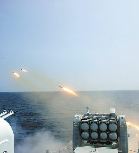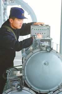 “魚雷對潛攻擊,左舷4號管,定深×米,打擊目標(biāo)!薄鞍l(fā)射!”隨著艦長一連串口令,魚雷入水逐浪撲向目標(biāo)。這時,其他各艦也開了火,數(shù)枚火箭彈、深水炸彈砸向目標(biāo),海面上沉悶的爆炸聲不絕于耳。不久,直升機(jī)上傳來目標(biāo)被摧毀的消息。