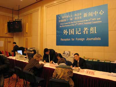 在記者的接待和安排方面,今年全國(guó)兩會(huì)在借鑒以前中共十七大期間一些好的做法的基礎(chǔ)上,還為中外記者推出了免費(fèi)上網(wǎng),免費(fèi)提供有關(guān)中國(guó)的圖書(shū)資料以及咖啡和餐點(diǎn)等一系列的貼心“服務(wù)”。祝壽臣介紹說(shuō):“這屆的兩會(huì)新聞中心借鑒了十七大一些好的做法,當(dāng)然同時(shí)也繼承了過(guò)去兩會(huì)新聞中心的一些好做法,增加了很多新的服務(wù)項(xiàng)目。比如第一次免費(fèi)提供中央人民廣播電臺(tái),中央電視臺(tái)的信號(hào),第一次免費(fèi)向記者提供新華社的適時(shí)新聞圖片,第一次免費(fèi)向記者提供寬帶上網(wǎng)服務(wù),同時(shí)我們還免費(fèi)向記者提供咖啡和茶點(diǎn)服務(wù)。此外,這次兩會(huì)還提供了很多圖書(shū)資料,有中國(guó)政治經(jīng)濟(jì)各方面的情況介紹,還有一些專(zhuān)題資料,資料種類(lèi)大概有100多種,資料擺上來(lái)以后很快就被中外記者搶空了!