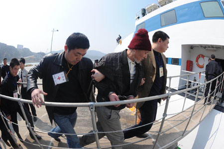 接下來的一切,是雙向遣返任務(wù)中的“常規(guī)動(dòng)作”:確認(rèn)王志華身份無誤后,臺(tái)灣執(zhí)法人員把他移交給大陸有關(guān)人員。頭戴帽子、胡子花白的王志華卸下了臺(tái)灣的手銬腳鐐,換上了大陸的手銬,在一前一后兩個(gè)佩戴紅十字會(huì)證件的工作人員押帶下登上扶梯進(jìn)入“海峽”號(hào)。
