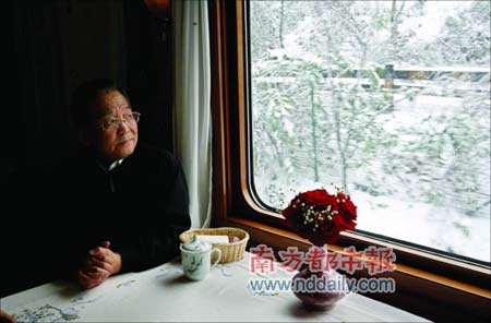 武漢當(dāng)時(shí)氣溫在零下,下著小雪,溫家寶直接從機(jī)場(chǎng)去火車站。鐵道部臨時(shí)調(diào)派的火車還沒到位,總理只好在火車站貴賓室等待。