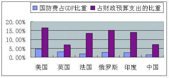 從絕對指標(biāo)來看,以2004年為例,美國的國防費(fèi)占全球國防費(fèi)總開支的47%,日本占4.1%,而我國僅占2.4%。從相對指標(biāo)看,美國國防開支占GDP的3.9%,我國是1.38%,其為我國的2.5倍。在國民人均國防費(fèi)開支、每平方公里平均國防費(fèi)等方面,我國在世界上均處于很低的水平。