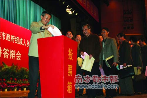 2月26日,南京舉行全市干部大會,與會者包括南京市四套班子領(lǐng)導(dǎo)成員、出席過黨的十七大和江蘇省十一次黨代會的代表等,共300多人。會上,人手一張選票,選票上有51個“填空題”:填寫51個部門區(qū)縣一把手的推薦人選,其中包括南京市政府47名組成人員人選和4位區(qū)(縣)委書記人選。