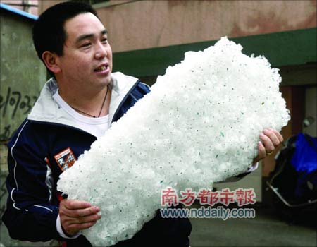 8日湖北省遭遇春季罕見(jiàn)雷雨大風(fēng)冰雹天氣襲擊。據(jù)有關(guān)部門統(tǒng)計(jì),目前這輪災(zāi)害天氣已造成當(dāng)陽(yáng)市、沙洋縣兩地共8人死亡,因?yàn)?zāi)受傷66人。同一時(shí)間,湖南省也遭遇了罕見(jiàn)雷雨大風(fēng)冰雹天氣的襲擊,在10多分鐘內(nèi)200余房屋被吹壞,3人受傷。8日5時(shí)30分左右,浙江省海寧市長(zhǎng)安鎮(zhèn)遭冰雹襲擊,整個(gè)過(guò)程持續(xù)約20分鐘,當(dāng)?shù)夭簧俜课、汽車等遭到不同程度的破壞?