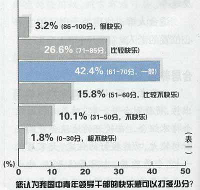心態(tài)指人們對待事物的心理態(tài)度,是人的心理對各種信息刺激做出反應(yīng)的趨向。心態(tài)構(gòu)成情緒,心態(tài)反映認知,心態(tài)決定行為。良好的心態(tài)必然產(chǎn)生快樂感、幸福感和滿意感,良好的心態(tài)也有助于提高人的工作效率和生活質(zhì)量,更有益于人的健康。此次調(diào)查顯示,大多數(shù)中青年干部給自己目前的工作、生活狀況打了較高分。就整體而言,在回答“若以百分制打分的話,您認為我國中青年領(lǐng)導(dǎo)干部的快樂感可打多少分?”時,有72.2%的人選擇了61分以上。(見表一)在個人層面,有50.4%的受訪者“對自己目前工作狀況的滿意度”給出了71分以上的高分,處于“很快樂”和“比較快樂”的心理狀態(tài),加上選擇61分~70分即“一般快樂”的28.8%,總計占了79.2%。(見表二)有60.7%的受訪者“對自己目前生活狀況的滿意度”給出了71以上的高分,處于“很滿意”和“比較滿意”的心理狀態(tài),加上選擇61分~70分即“一般滿意”的25.6%,總計達到了80.3%。(見表三)上述結(jié)果表明,大多數(shù)中青年干部心態(tài)良好,但極少數(shù)人表達出來的不快樂、不滿意傾向也不容忽視,這一傾向往往是構(gòu)成心理和行為問題的潛在因素。