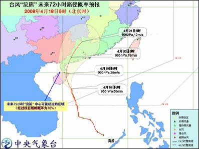 中新網(wǎng)4月18日電 據(jù)問天網(wǎng)消息,中央氣象臺今天早晨六點鐘發(fā)布臺風橙色緊急警報:今年第1號臺風浣熊(NEOGURI)的中心今天早晨5點鐘位于海南省萬寧市東南偏南方向大約180公里的南海中部海面上,就是北緯17.5度,東經(jīng)111.4 度,中心附近最大風力有13級(38米/秒)。