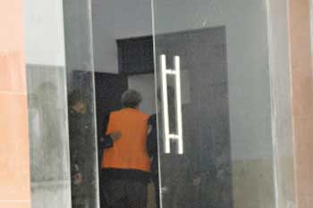 本報河南南陽訊 (特派記者李穎、廖杰華攝影報道)昨日上午9時30分,吳天喜涉嫌強奸、領(lǐng)導(dǎo)黑社會性質(zhì)組織案二審開庭,河南省高級人民法院在南陽內(nèi)鄉(xiāng)縣法院開庭審理此案?9時,記者跟隨吳天喜和其余被告到了法庭外。吳天喜被單獨安排在一個房間內(nèi)看守,在等待開審的時間內(nèi),吳天喜幾乎一動不動地坐著。進法庭的時候,他抬頭看了一眼外面等待的親屬,挪進法庭。