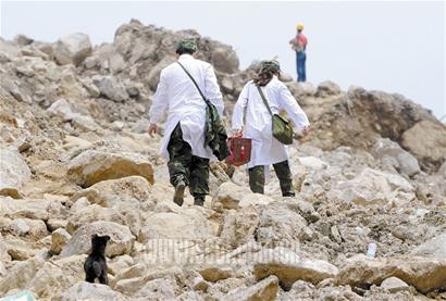昨日下午2時(shí)許,本報(bào)記者一行人經(jīng)過3個(gè)小時(shí)徒步行軍,抵達(dá)一個(gè)叫山邊坪的地方,這里是成都軍區(qū)空軍的臨時(shí)駐地,距離銀廠溝溝口不足四公里。一個(gè)幾乎被地震摧毀的農(nóng)家樂旁,部隊(duì)?wèi)?zhàn)士正在埋鍋?zhàn)鲲,一些?zhàn)士拖著疲憊的雙腿,扛著鐵鍬等工具往下撤退;一些戰(zhàn)士正在就地掩埋尸體。營(yíng)地旁邊的臨時(shí)停機(jī)坪,直升機(jī)從溝下轟鳴著而來(lái),不時(shí)降落此地。