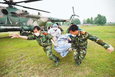 根據(jù)小分隊提供的信息,17日下午,綿竹市聯(lián)合陸軍航空兵某部對清平鄉(xiāng)重傷員實施了緊急救援。這是自12日發(fā)生地震后,從清平鄉(xiāng)接出的首批受傷群眾。(李 舸攝影報道)