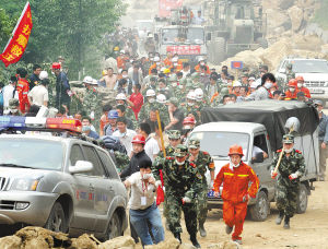 據(jù)戰(zhàn)士介紹,他們今天看到至少有4名以上幸存者從北川的廢墟中被搶救出來,其中還包括一對80多歲的夫婦。