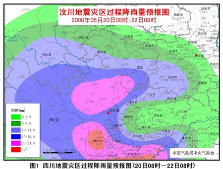 20-21日,震中及其附近地區(qū)將有一次中雨過程,四川汶川、北川、理縣、茂縣、綿竹等重災(zāi)區(qū)的降雨量有8-22毫米,四川松潘、黑水、馬爾康以及甘肅文縣降雨量可達(dá)25-40毫米(圖1),并伴有短時(shí)雷電、雷雨大風(fēng)等強(qiáng)對流天氣。22日,震區(qū)還將有2-8毫米的降雨(圖2)。需注意局地強(qiáng)降雨給抗震救災(zāi)工作帶來的不利影響。