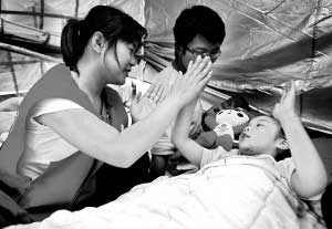 在中心醫(yī)院的大廳里,一個(gè)頭部受傷比較明顯的少年引起她的注意。她走上去,了解到這個(gè)名叫丁怡的男孩今年14歲,地震中頭部受傷,好在沒(méi)有傷到腦部,從容的交流,自然的表情讓黨育新覺(jué)得這個(gè)少年基本上沒(méi)有什么問(wèn)題,不過(guò)她仍然和這個(gè)少年交換了電話,“我也是孤兒,你就和阿姨交個(gè)朋友吧!