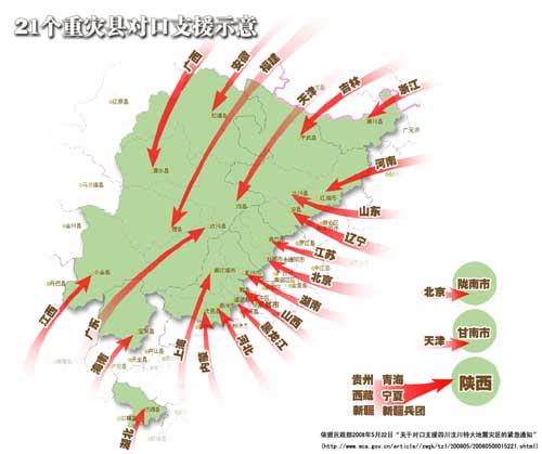 二十一個(gè)對(duì)口支援省份為上海支援都江堰市,湖南支援彭州市,黑龍江支援溫江區(qū),山西支援郫縣,內(nèi)蒙古支援大邑縣,河北支援崇州市,江蘇支援綿竹市,北京支援什邡市,遼寧支援安縣,山東支援北川縣,吉林支援平武縣,河南支援江油市,廣東支援汶川縣,福建支援理縣,天津支援茂縣,安徽支援松潘縣,江西支援小金縣,廣西支援黑水縣,浙江支援青川縣,湖北支援漢源縣,海南支援寶興縣。