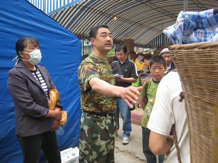 在北川抗震指揮部,有人告訴記者王洪發(fā)在上面,急急忙忙往上跑,找到了發(fā)放物資所在地。工作人員說,王洪發(fā)剛剛離開,北川醫(yī)院的女護士們這樣形容:“到下面去看,一個多高多帥的,穿迷彩服的就是!痹俣扰艿娇拐鹬笓]部,在帳篷里找到了王洪發(fā),他不停地分配任務,不斷接電話,記者無法插話。一邊接電話,王洪發(fā)一邊往民政局所在的帳篷走過去。半道上,桂溪鄉(xiāng)敬老院院長李元貴攔住了他:“敬老院現(xiàn)在還差帳篷。”
