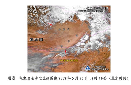 據(jù)監(jiān)測,昨天(5月26日)下午至今天早晨,受蒙古氣旋和冷空氣的共同影響,內(nèi)蒙古中部和東部偏南地區(qū)出現(xiàn)了大范圍的揚(yáng)沙和沙塵暴天氣,其中,二連浩特能見度只有400米,蘇尼特左旗和那仁寶力格能見度同為600米,烏拉蓋、東烏珠穆沁旗、蘇尼特右旗、阿巴嘎旗和克什克騰旗能見度為700-800米。