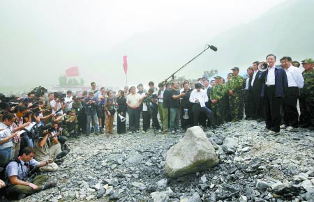 15時(shí)55分,新華網(wǎng)再次發(fā)出快訊:胡錦濤總書記作出重要指示,要求盡快搶救傷員,保證災(zāi)區(qū)人民生命安全。溫家寶總理趕赴災(zāi)區(qū)。