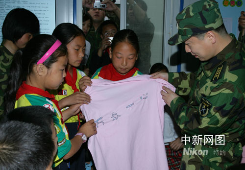 楊利偉到來后,少先隊員給楊利偉戴上了鮮艷的紅領(lǐng)巾。八一帳篷學(xué)校的學(xué)生楊盼盼、趙珊、母卓欣送上了一件T恤,上面有她們用一晚上的時間繡上的四個字:“萬眾一心”。