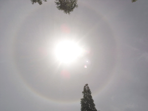 又訊 “不會(huì)又有事情發(fā)生吧?”、“不會(huì),這是一個(gè)好兆頭!”昨日中午11時(shí)38分,記者到達(dá)青川縣城時(shí),許多市民正仰天觀望,議論紛紛。有的市民稱(chēng),他們這輩子還是第一次見(jiàn)到這么大的日暈。記者抬頭發(fā)現(xiàn),在上空出現(xiàn)了一個(gè)巨大圓形,圍繞著太陽(yáng),最里面是一片灰色,外面依次是紅色、淺綠色和白色,這一現(xiàn)象持續(xù)了一個(gè)多小時(shí)才消失。