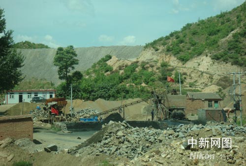 秦王村附近的簡陋的小選鐵廠,其后如瀑布般的尾礦將山體遮蓋。