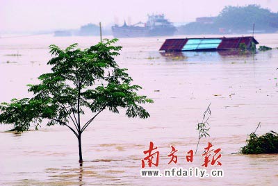 記者在鶯哥咀水文站附近看到,內(nèi)河堤內(nèi)的香蕉樹及其他一些防洪樹木,此刻全部被淹沒在洪水中,只露出樹梢在外面搖擺。在離水文站不遠(yuǎn)處,一管樁廠也全部被洪水淹沒。一村民告訴記者,該廠的所有員工已于日前全部撤至安全地帶。
