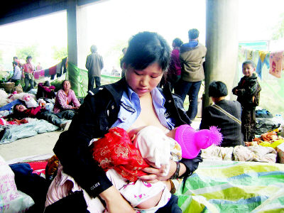 資料圖:蔣曉娟一手一個為災區(qū)嬰兒哺乳。