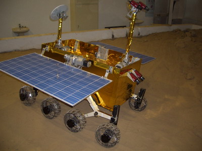該新型8輪月球車車體部分包括兩片能夠重復(fù)展開和定位的太陽能帆板以及相機(jī)桅桿,還有定向天線、全向天線、前后避障相機(jī)、電源系統(tǒng)和主控系統(tǒng),能自如地爬越模擬環(huán)境中的石頭、斜坡等障礙物,能輕松地跨過深坑,8個(gè)車輪獨(dú)立驅(qū)動(dòng),4個(gè)角輪是轉(zhuǎn)向輪,可靈活轉(zhuǎn)向。這輛車的移動(dòng)系統(tǒng)構(gòu)型已獲得國家發(fā)明專利。