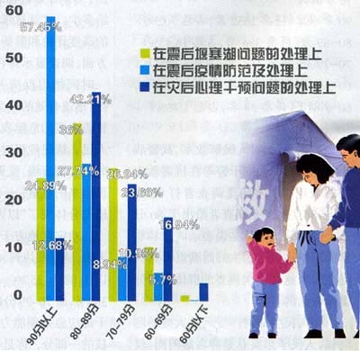 數(shù)據(jù)表明,對(duì)黨和政府在抗震救災(zāi)中的表現(xiàn),滿意率達(dá)到94.81%。其中,對(duì)黨和國(guó)家領(lǐng)導(dǎo)人在抗震救災(zāi)中的表現(xiàn),受調(diào)查者普遍表示了高度贊揚(yáng),90%的受訪者表示滿分是多少就給多少。這就意味著群眾對(duì)黨和政府的高度評(píng)價(jià)和贊揚(yáng)。其中得分最高的方面,調(diào)查顯示排在前四位的是:在第一時(shí)間做出反應(yīng)并趕赴抗震救災(zāi)前線、迅速有效的應(yīng)急反應(yīng)和指揮部署、冒著余震的危險(xiǎn)夜以繼日地安撫災(zāi)區(qū)人民、情況危機(jī)時(shí)刻和看望災(zāi)區(qū)人民時(shí)的動(dòng)情言語。受調(diào)查者表示,政府表現(xiàn)出來的尊重每一個(gè)平民的生命的舉措充分體現(xiàn)了“以人為本”的理念。