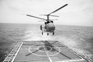 “丁零零!”戰(zhàn)斗警報(bào)響徹戰(zhàn)艦。“××海區(qū)發(fā)現(xiàn)水下可疑目標(biāo),立即搜索!”一聲令下,艦載反潛直升機(jī)躍上藍(lán)天,在艦艇編隊(duì)前方偵測(cè)鎖定水下活動(dòng)目標(biāo)。
