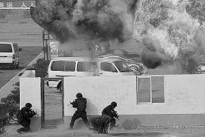 在指揮員下達(dá)攻擊令的余音聲中,突擊分隊(duì)兵分5路向目標(biāo)發(fā)起攻擊:從地下鉆出的特戰(zhàn)隊(duì)員,對(duì)大廳兩名歹徒實(shí)施了無聲射殺,迅速排除了出入口爆炸物,為救援行動(dòng)打開了通道。空中垂降的特戰(zhàn)隊(duì)員從天窗潛入“歹徒”所在的樓層,乘坐攀登突擊車的兩組隊(duì)員左右破窗,與空中垂降的戰(zhàn)友同時(shí)攻入大廳,“歹徒”未及反抗,就被一一擊斃或制服。樓頂?shù)奶貞?zhàn)隊(duì)員在對(duì)防護(hù)窗實(shí)施精確爆破后,利用繩索從天而降,破窗而入,身體騰空中,舉槍擊發(fā),“歹徒”未及反應(yīng),就已中彈斃命,人質(zhì)被安全解救。