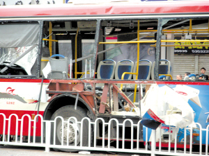 記者看到,公共汽車車體的一側(cè),在駕駛員后的位置,爆炸造成一個(gè)1.5米左右的裂口,部分座位變形,車體后部則完好無(wú)損,但車窗玻璃已全部爆碎,車體車窗玻璃及膠條最遠(yuǎn)的飛出了10多米,附近全是玻璃碎片,數(shù)十名警察拉起了警戒線。