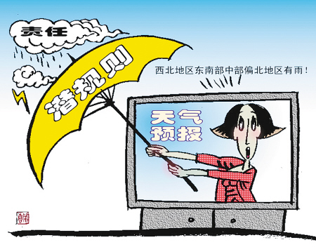 天氣預(yù)報(bào)曾被批為“四大不準(zhǔn)”之首,原來氣象專家們學(xué)會了“太極拳”,啟用了“潛規(guī)則”,以一串模糊不清的詞語,讓百姓不知所云,自己無責(zé)一身輕了!這層窗戶紙被“業(yè)內(nèi)人士”捅破后,長期被忽悠、愚弄的觀眾忍不住發(fā)問:每天黃金時(shí)間播報(bào),那么多經(jīng)費(fèi)供養(yǎng),竟然貢獻(xiàn)出這樣的東東,這節(jié)目、這專家、這部門還要它干什么?的確,天氣預(yù)報(bào)不準(zhǔn)確,百姓會很有意見,但即使報(bào)錯了,氣象部門也沒有哪個受到撤職或處分。民憤起于一時(shí),但很快會歸為理性,作為“氣象人”,何必自作聰明用模糊語言忽悠民眾、罔顧己責(zé)呢?