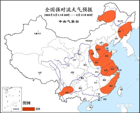 中新網(wǎng)8月13日電 據(jù)中國(guó)天氣網(wǎng)消息,中央氣象臺(tái)今晨六時(shí)繼續(xù)發(fā)布強(qiáng)對(duì)流天氣預(yù)報(bào):