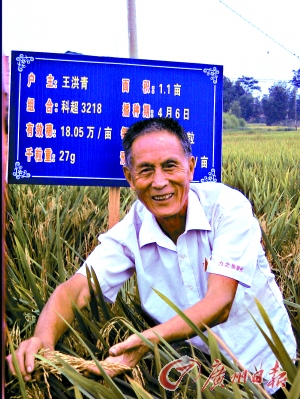 該鄉(xiāng)農(nóng)技站長(zhǎng)鄒都樂介紹說,王洪青種的這種水稻是袁隆平院士新研制的品種“科超3218”,前幾天經(jīng)專家田間現(xiàn)場(chǎng)測(cè)產(chǎn),每畝有效穗超過18萬支,平均每穗實(shí)粒207粒,按每千粒27克計(jì)算,預(yù)計(jì)今年畝產(chǎn)達(dá)到1008公斤。“如不出意外,今年牛形嘴村這塊102畝的試驗(yàn)田,平均畝產(chǎn)將鐵定突破900公斤。”鄒都樂說,村里去年就開始種上袁院士的這種超級(jí)稻,去年8月份,眼看長(zhǎng)勢(shì)喜人的水稻即將割鐮,可惜突然來了一場(chǎng)“圣帕臺(tái)風(fēng)”,一夜之間將水稻刮倒許多。最后收割時(shí)一測(cè)算,畝產(chǎn)只有870公斤!叭绻麤]有那場(chǎng)臺(tái)風(fēng),畝產(chǎn)900公斤的目標(biāo)去年早就提前實(shí)現(xiàn)了!”