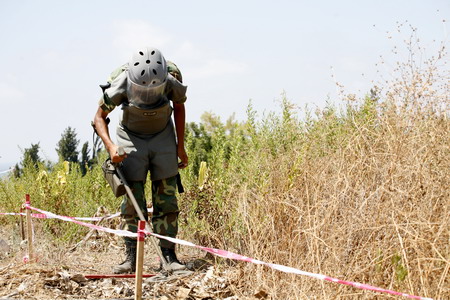 9月10日,地中海灼熱難耐,在位于黎巴嫩南部黎以交界處的艾塔山埠村西南側(cè)半山腰上,一群來自成都軍區(qū)的中國維和軍人頭戴防護(hù)面罩、身穿厚厚的防護(hù)服,正在冒著生命危險為當(dāng)?shù)厝嗣駫叱麄冃闹杏肋h(yuǎn)的痛——雷區(qū)。